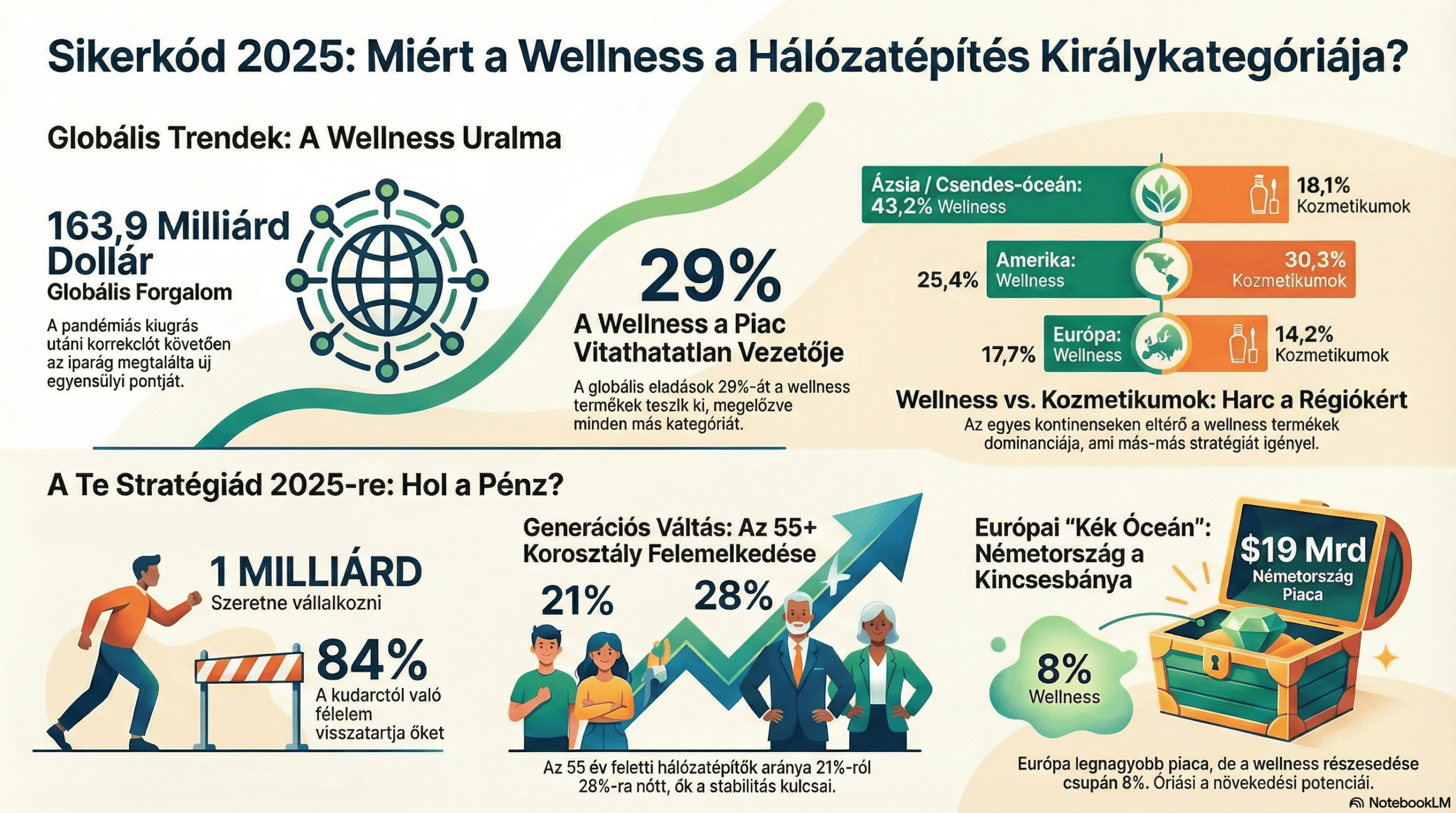 Marketing Tipp 4Life Partnerként: A kommunikációdban hangsúlyozd, hogy te nem egy „eladó” vagy, hanem egy olyan globális trend (Wellness forradalom) része, amelyre a legnagyobb a piaci kereslet. A 4Life termékei nem „kiegészítők”, hanem a legkeresettebb kategória csúcsragadozói. A kommunikációdban használd ezt a kontrasztot! „Míg a világ nagy része még mindig a felszíni kezelésekkel (kozmetikumok) van elfoglalva, a tudatos vásárlók már rájöttek: a valódi ragyogás az immunrendszernél kezdődik. A statisztikák nem hazudnak: Ázsiában már kétszer annyian választják a Wellnesst, mint a sminket. Ne maradj le a trendről, ami Európát is éppen most hódítja meg!”